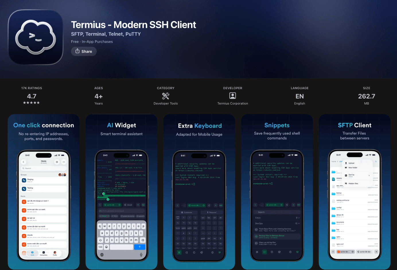For the SSH client, I used Termius. It covers both iOS and Android with a clean interface, and the free tier handles everyday use fine.