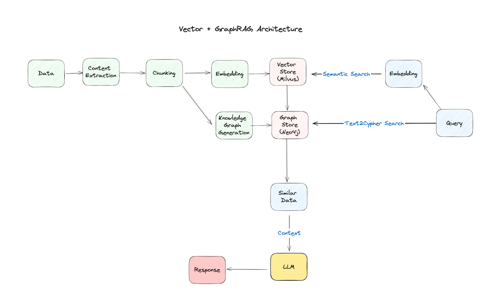 - Retrieval – The agent retrieves relevant information from Milvus (using vector search) and Neo4j (using Graph Generation).