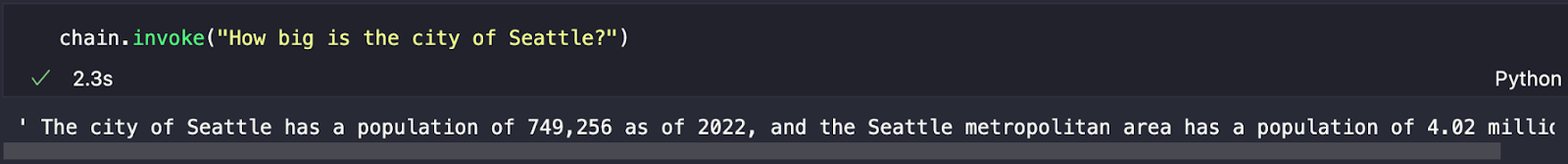 For the example of “How big is the city of Seattle,” we can see an expected output below. The response is accurate and backed by the Wikipedia information we’ve stored in the vector database.
