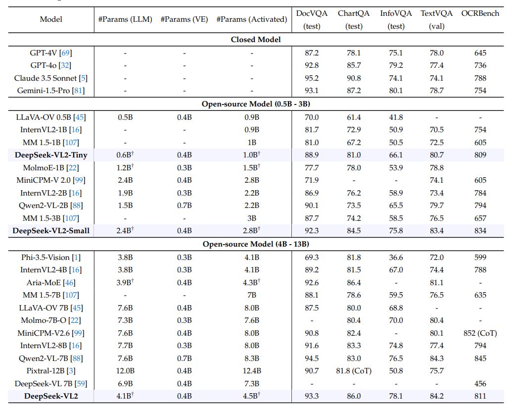 - Efficiency and Scalability: DeepSeek-VL2 attains competitive results with fewer activated parameters thanks to its efficient MoE design and dynamic tiling approach. This balance between performance and resource usage enables deployment in environments with limited computational capacity.