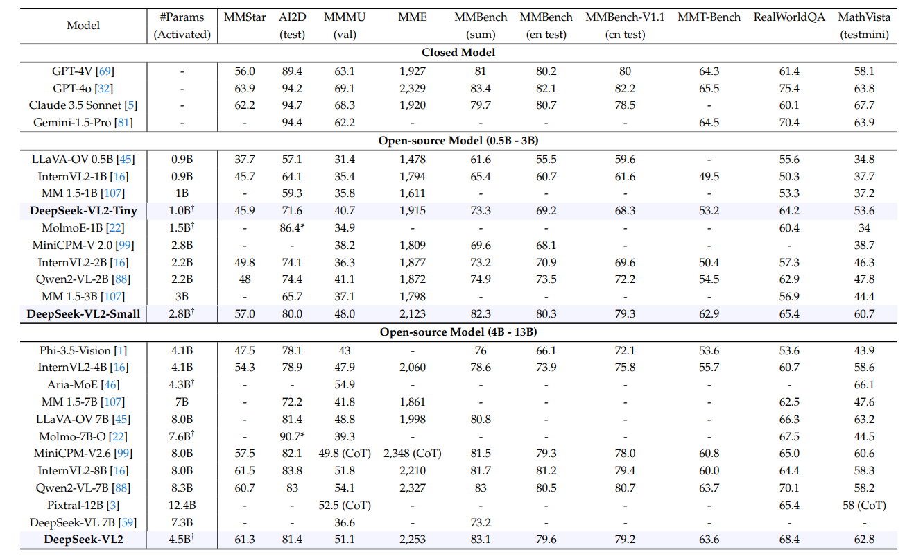 - DeepSeek-VL2-Small: 2.8B parameters, 64 experts