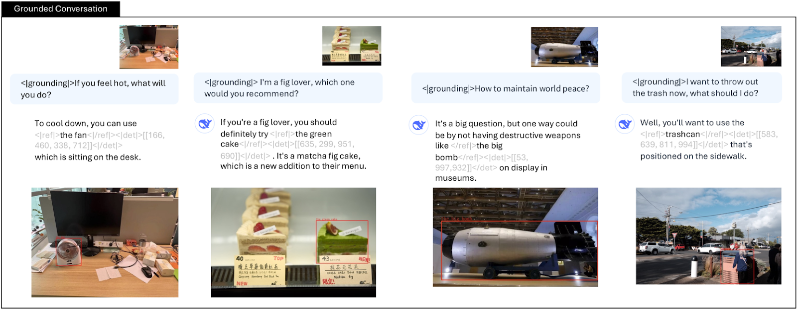 - Grounding Conversation: With the use of special grounding tokens <|grounding|>, the model refers to key objects with precise location details, enhancing its interactive capabilities. Its grounded responses facilitate practical applications in real-world interactive systems.