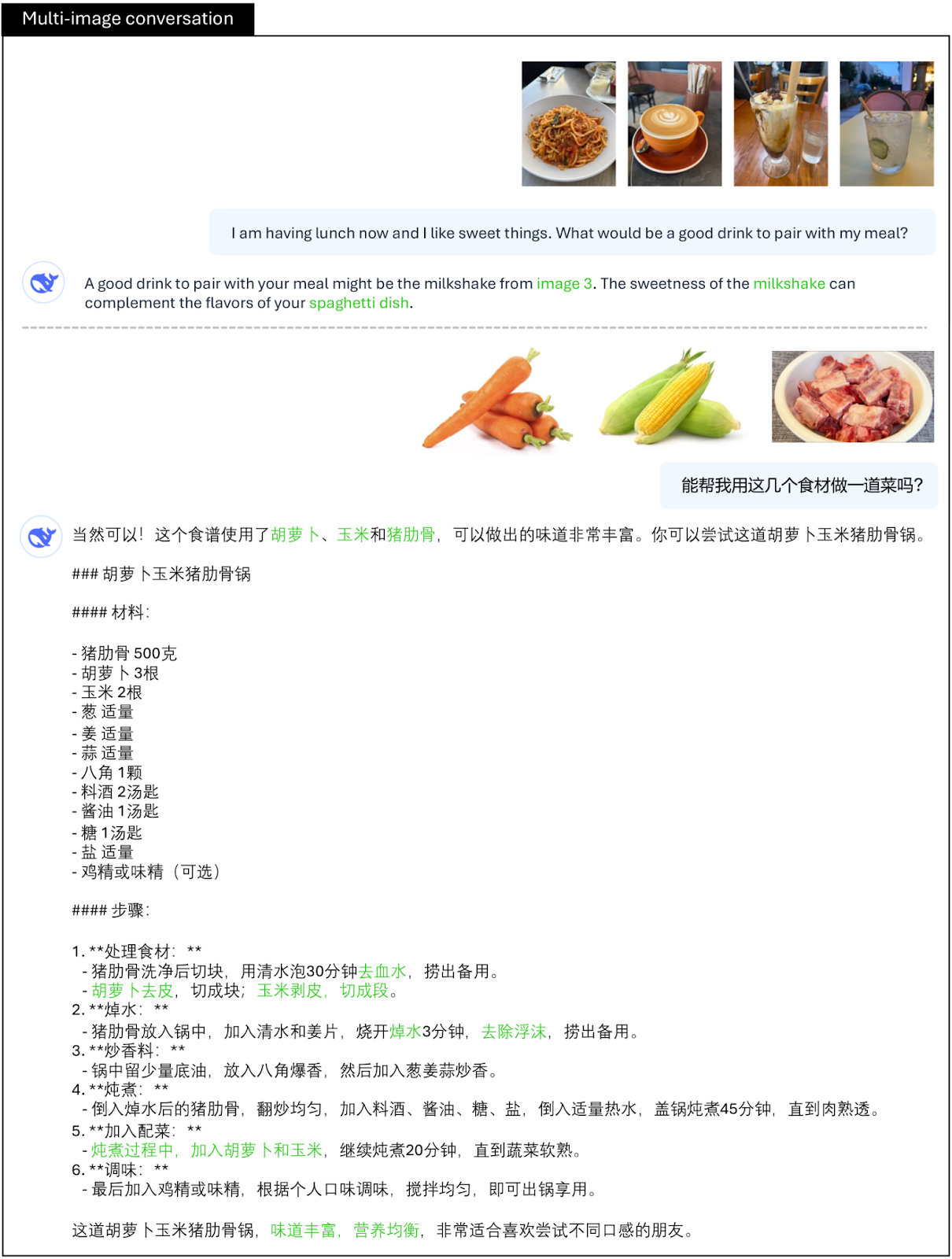 - Multi-Image Conversation: It effectively analyzes the associations and differences among multiple images while enabling simple reasoning by integrating the content of several images. For example, it can consider how to prepare a dish based on images of certain ingredients.