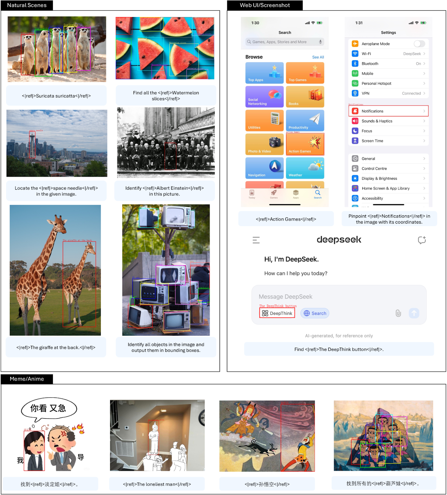 - Visual Grounding: The model successfully identifies and locates objects in images, generalizing them from natural scenes to varied scenarios such as memes and anime. It demonstrates robust performance even when objects are partially obscured or presented in challenging conditions.