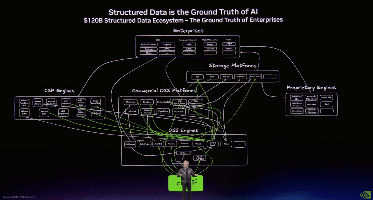 If you look closely at the infrastructure diagrams Jensen Huang has been using, the center of gravity is moving. In the structured data era, frameworks like Spark sat at the heart of the pipeline. In the era of unstructured data, vector infrastructure like Milvus is beginning to fill that role. Not because vector search is the only thing that matters, but because it increasingly sits at the junction between raw data, embeddings, indexes, and application retrieval.