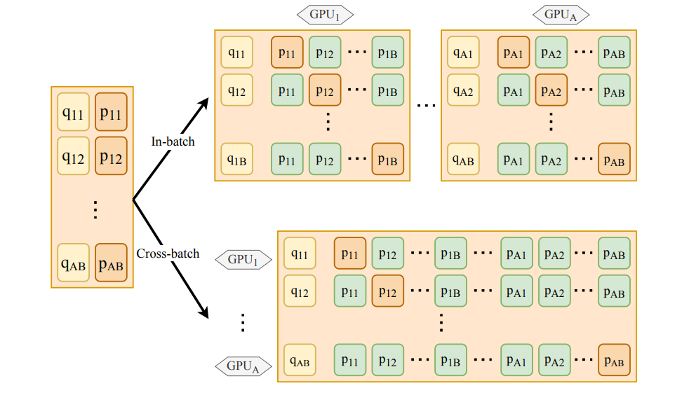 Figure: Comparison of in-batch vs. cross-batch negatives in multi-GPU training, where A is the number of GPUs and B is the batch size.