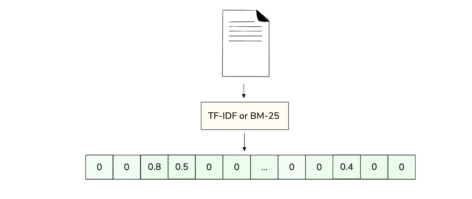 Both TF-IDF and BM25 can be represented as sparse embeddings. A sparse embedding is an n-dimensional vector, where the dimensionality depends on the number of unique terms in our corpus or collection of documents.