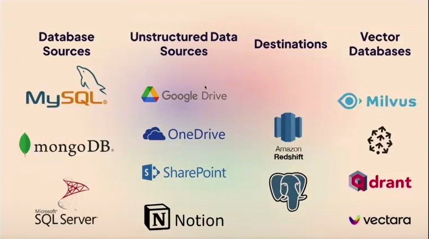 In the past six months, from March 2024 backward, Airbyte has expanded its capabilities to cover unstructured data sources in addition to traditional tabular data sources. This is due to the growing importance and prevalence of unstructured data in today’s data ecosystem. This expansion has seen Airbyte go beyond SQL-type and file-type destinations to cover vector database destinations like Milvus, ensuring we can effectively utilize data across various applications. Let's have a look at some of the connectors supported by Airbyte for both structured and unstructured data sources.
