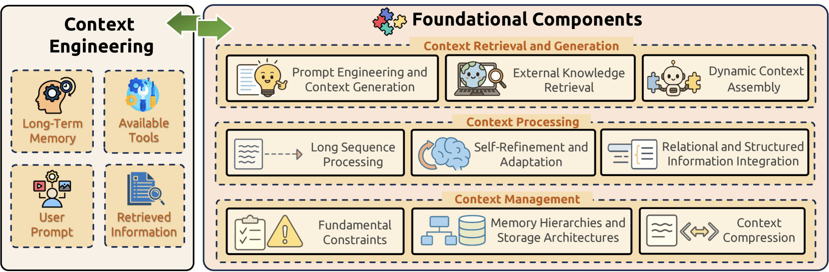 - Context Management tackles efficient organization and utilization of contextual information through addressing fundamental constraints, implementing sophisticated memory hierarchies, and developing compression techniques.