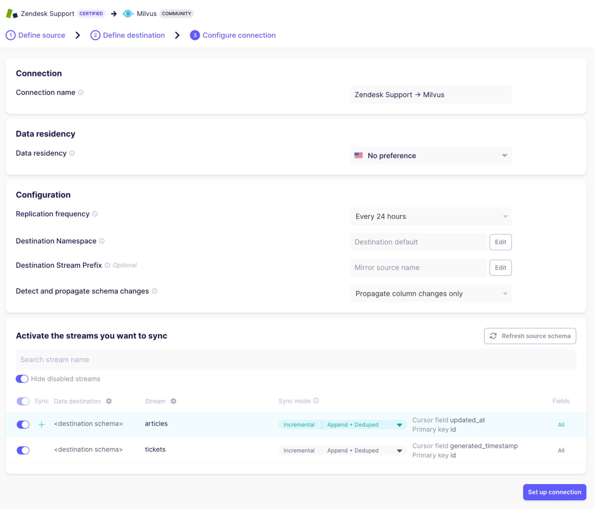 You can select which fields to extract from the source by clicking the stream name. The “Incremental | Append + Deduped” sync mode means that subsequent connection runs keep Zendesk and Milvus in sync while transferring minimal data (only the articles and tickets that have changed since the last run).
