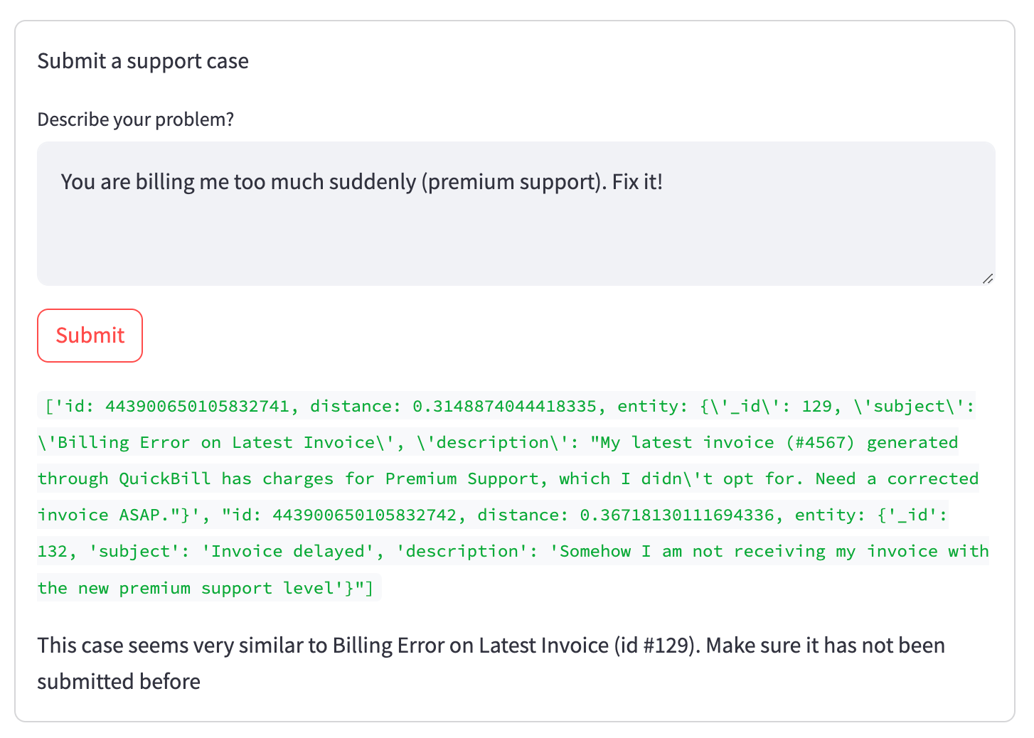Next, let’s check for existing open tickets that might be relevant. To do this, we embed the text the user entered using OpenAI, then did a similarity search on our collection, filtering for still open tickets. If there is one with a very low distance between the supplied ticket and the existing ticket, let the user know and don’t submit: