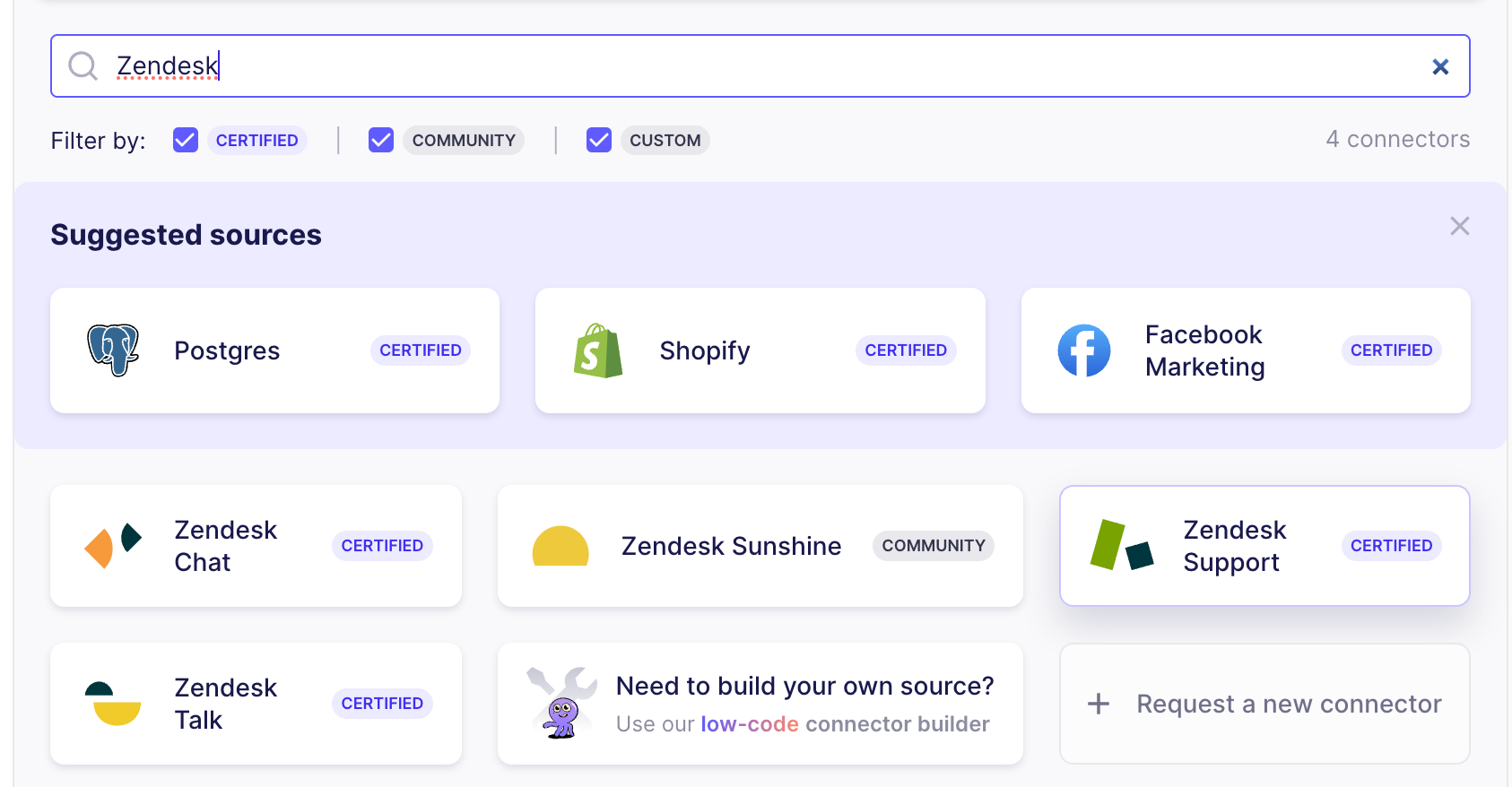 Once your instance is running, we need to set up the connection — click “New connection” and pick the “Zendesk Support” connector as the source.