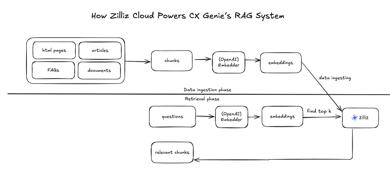 At the heart of CX Genie’s conversational AI platform is a two-phase pipeline powered by Retrieval-Augmented Generation (RAG): the data ingestion phase and the retrieval phase. Zilliz Cloud plays a critical role in ensuring both are performant and scalable.