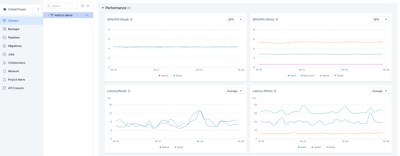 With vector databases like Zilliz Cloud playing a crucial role in modern AI applications, evaluating their real-time performance is essential. Zilliz Cloud has recently introduced a comprehensive monitoring functionality to track system performance and status in real-time. These enhancements provide customizable alerts and monitor a range of key metrics, including CPU usage, latency, queries per second, vectors per second, and storage consumption. The system also tracks the number of loaded entities alongside entity and collection counts, ensuring full visibility into database operations.