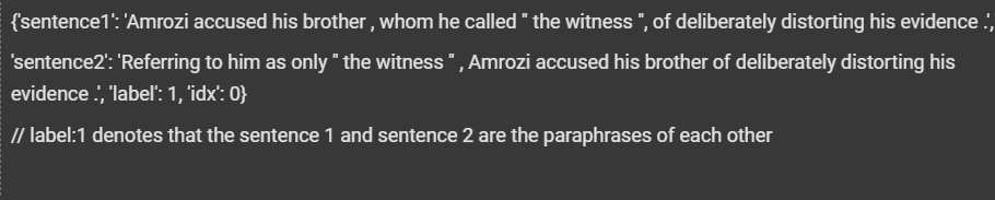 This snippet uses the HuggingFace Datasets library to load the MRPC dataset from GLUE, making it easy for developers to start experimenting with these tasks. HuggingFace has made it straightforward for practitioners to quickly access and utilize GLUE datasets for model training, evaluation, and fine-tuning.