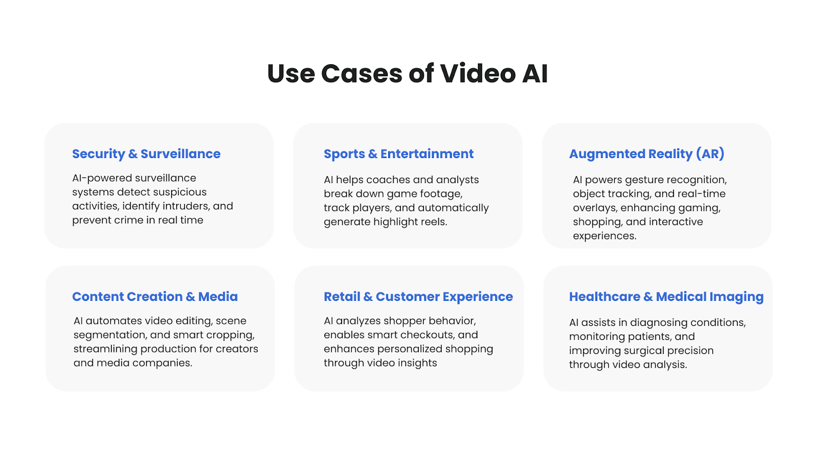 Video AI is reshaping industries by enabling automation, enhancing insights, and improving user experiences. Some of the most impactful applications include:
