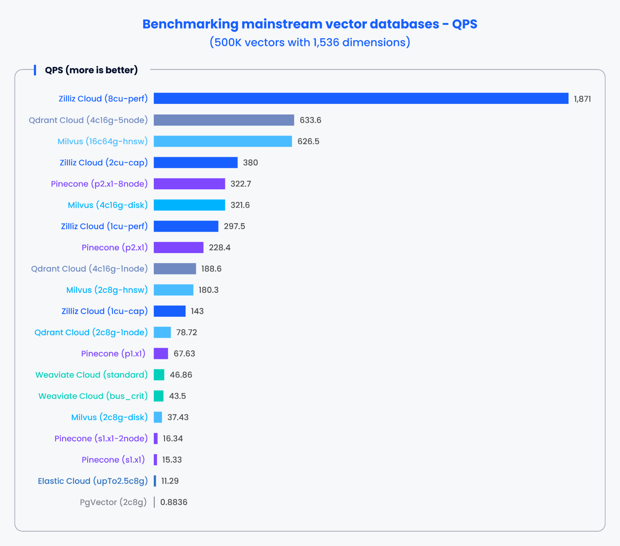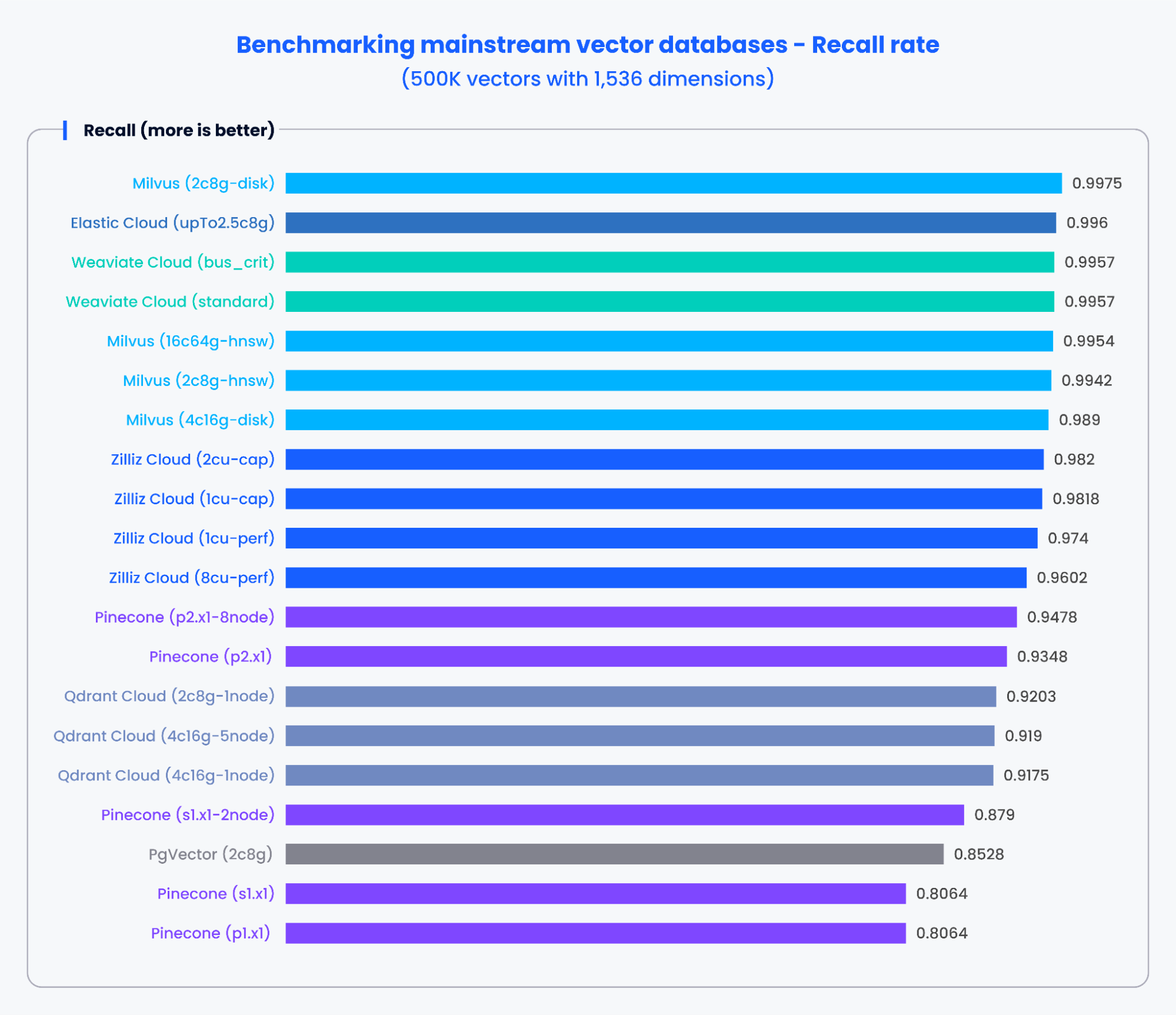 上記のグラフの結果から、MilvusやZillizのような専用に構築されたベクトルデータベースは、QPSと想起率の両方で卓越した性能を示した。これらの結果は、専用に構築されたベクトル・データベースが膨大な量のデータを迅速に処理し、より正確な結果を取り出すことができることを示している。対照的に、従来のデータベースをベースとしたベクトル検索アドオンは、より低いパフォーマンスを示した。