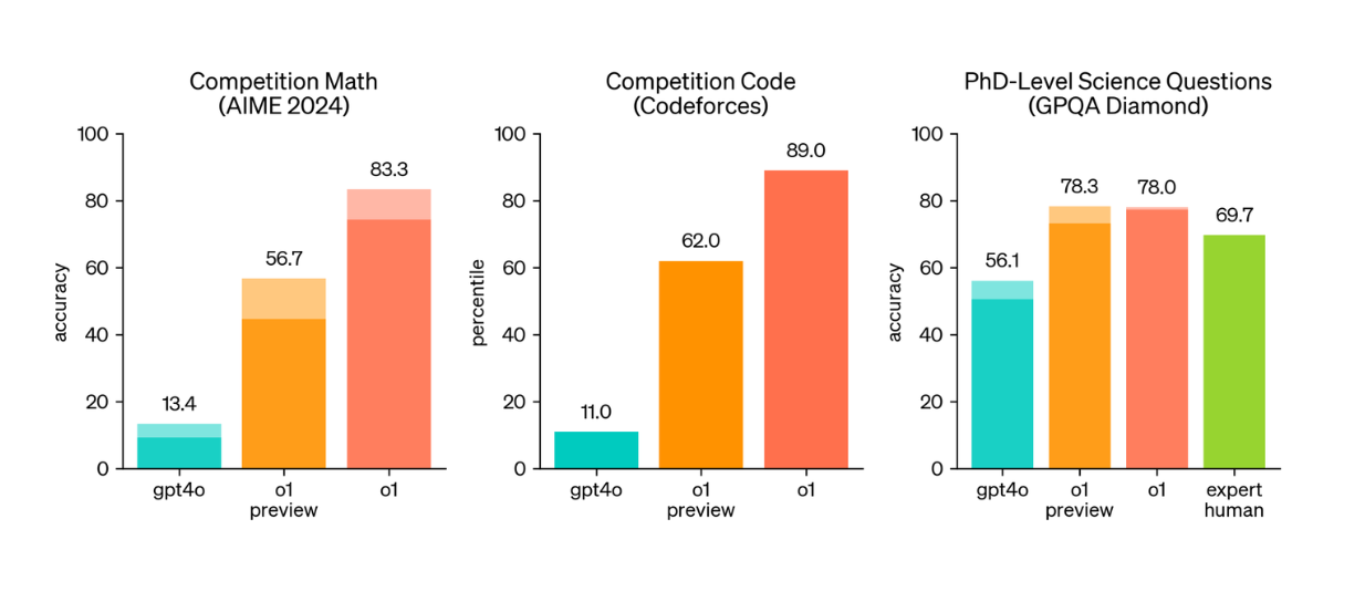 本質的に、o1モデルはGPT-4oの素晴らしさの全てをベースにしていますが、思考の連鎖(CoT)と強化学習(RL)アプローチを組み合わせることで、その限界をさらに押し広げています。その結果、o1モデルは、コーディング、数学、一般科学など、複雑な推論を必要とする様々なドメインにおいてGPT-4oを凌駕します。