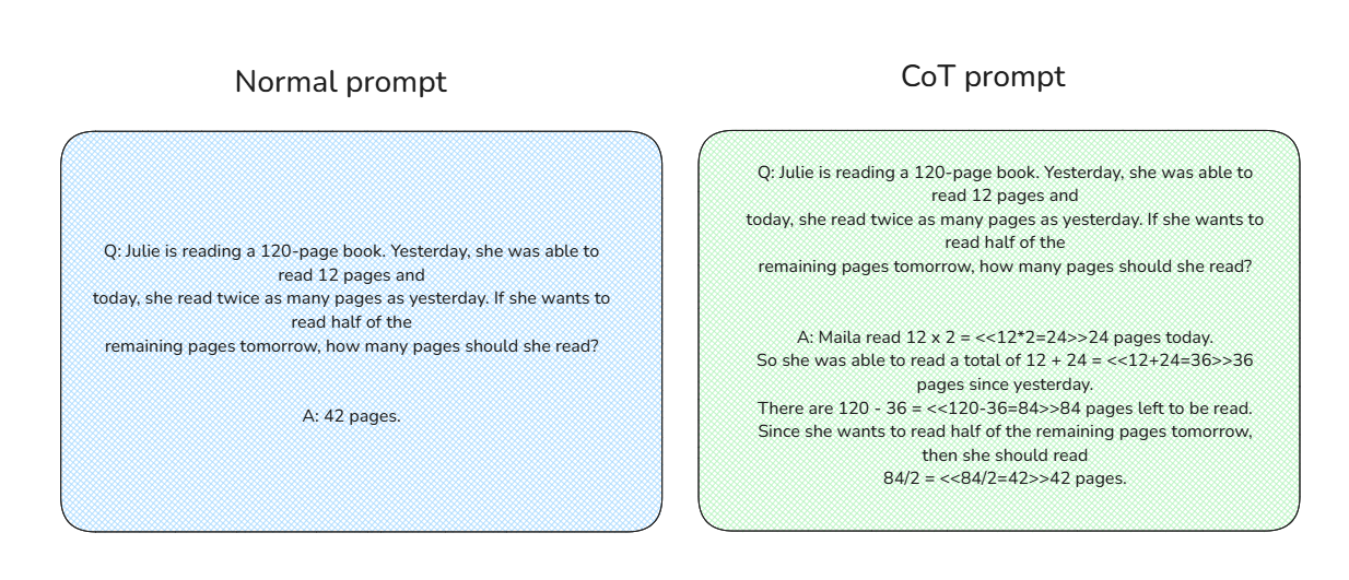 CoTプロンプティングのコンセプトは単純だ。与えられた問題に対する直接的な答えをモデルに与える代わりに、CoTプロンプトには、以下に示すように、問題を解くための詳細な文脈上の手順が含まれる: