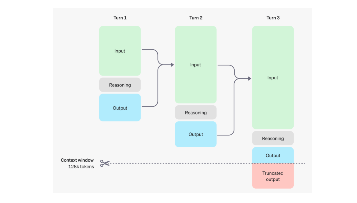 これらの推論トークンにより、モデルはプロンプトを分析し、出力トークンを生成する前に複数のアプローチを検討することができる。回答が確定すると、推論トークンはコンテキストから破棄される。以下は、ユーザーとモデルの相互作用の複数のラウンドにおける入力、出力、および推論トークンのダイナミクスの視覚化です: