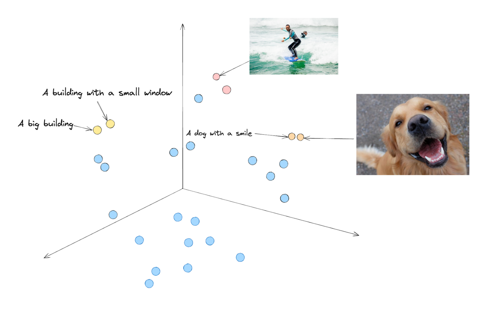 上の図のように、「微笑む犬」という文章と微笑む犬の画像があるとします。CLIPは、まずテキストと画像の両方を同じような次元の埋め込みに変換し、ベクトル空間を確認すると、両方の埋め込みは互いに近くに配置される可能性が高い。