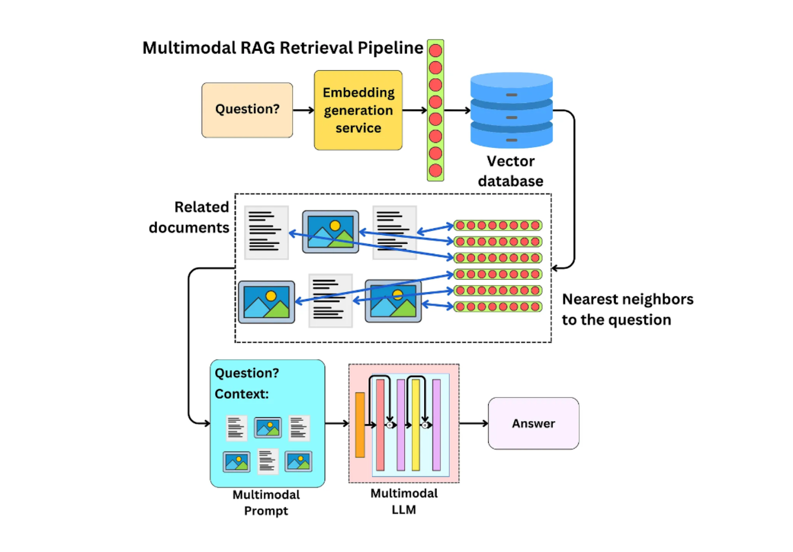 これで、任意のクエリに対して、前に使ったのと同じテキストベースの埋め込みモデルを使って、埋め込みに変換することができる。その後、最も関連性の高いコンテキストを見つけるために類似検索を実行し、テキストベースのコンテキストをテキストベースまたはマルチモーダルLLMのプロンプトの一部として使用することができます。