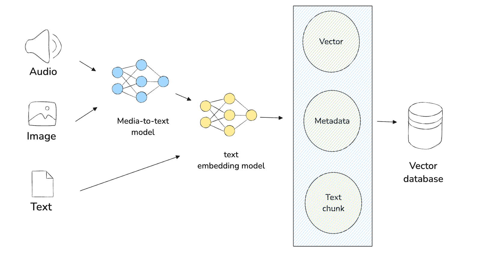 画像のテキスト要約ができたら、text-based embedding model を使って、文書中の他のテキストと一緒にこのテキストを埋め込みに変換することができます。SentenceTransformers、OpenAI、VoyageAIなど、多くのテキスト埋め込みモデルがあります。これらのテキストの埋め込みは、ベクトルデータベースに格納され、インデックス化されます。