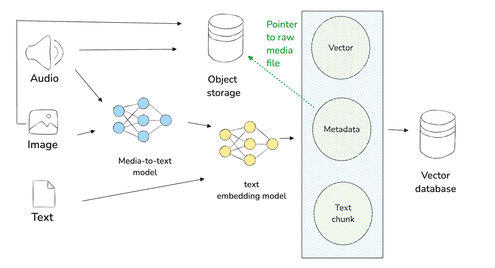 このパターンの実装では、2つの異なるステップを実行する必要がある。まず、実際の生データをAWS S3やGoogle Cloud Storageのような専用のオブジェクトストレージシステムに保存する。第二に、ベクターデータベース内に生データのメタデータを格納する。