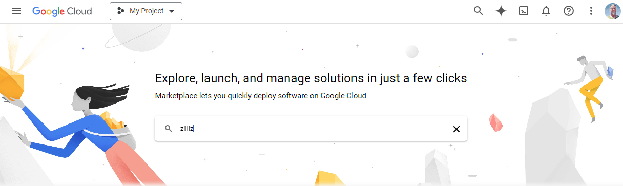 Now that you are subscribed to Google Cloud, if you are not at the Google Cloud Marketplace screen or other screen with a "Search Marketplace" search box near the top, you can go directly there via https://console.cloud.google.com.