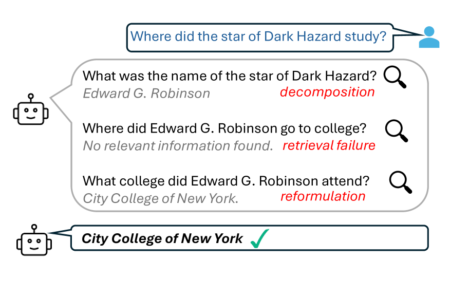 Final answer prediction: Synthesizing retrieved evidence into a complete response. Lfinal answer= -logP(A|Q,Q1:L,D1:k)