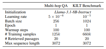 Llama-3.1-8B-Instruct is fine-tuned on the augmented datasets, with separate models trained for multi-hop QA and the KILT benchmark. The model uses distinct learning rates—510-6 for multi-hop QA and 10-5 for KILT benchmark—to ensure effective adaptation. The multi-hop QA dataset includes 125k training examples, while the KILT benchmark consists of 660k examples after sub-sampling. To enhance stability during early training, 100 warmup steps are applied. Each model retrieves 20 passages per query and processes sequences up to 3072 tokens in length.
