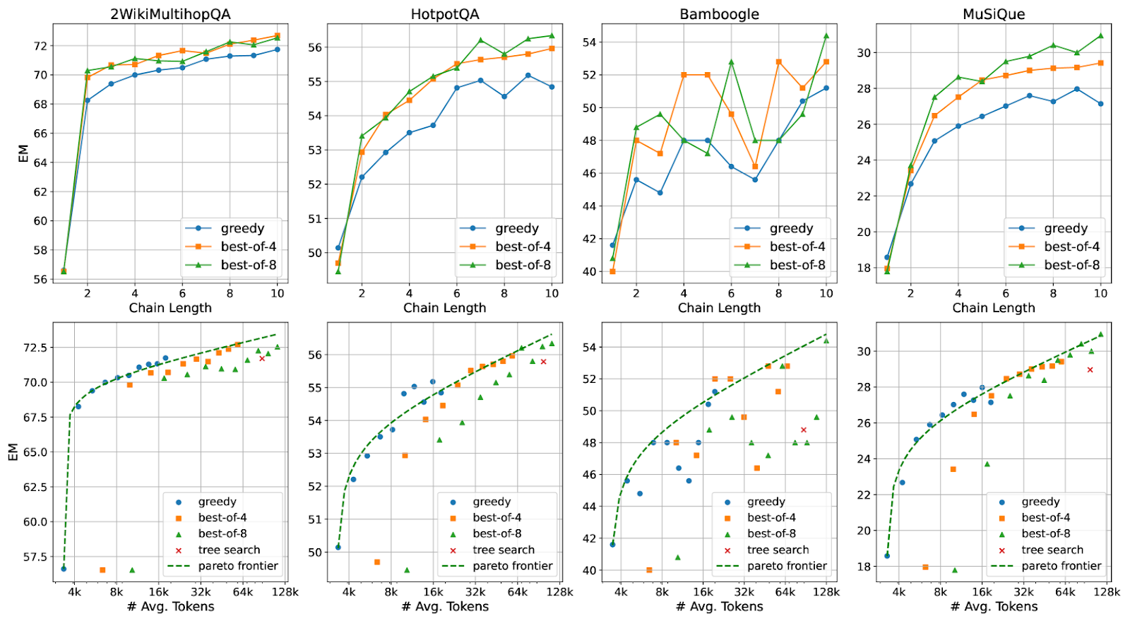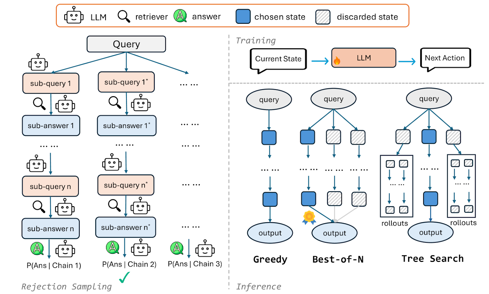Best-of-N sampling (balanced approach): The model samples N different retrieval chains with a temperature of 0.7 and picks the best one. It penalizes chains that retrieve irrelevant information to decide the best chain.