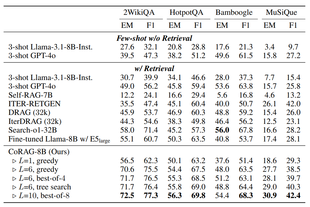 CoRAG’s capabilities are evaluated across two benchmark categories. The first assessment focuses on step-by-step reasoning using multi-hop QA datasets: 2WikiMultihopQA, HotpotQA, Bamboogle, and MuSiQue. These datasets test the model’s ability to perform step-by-step reasoning across multiple pieces of information. The second evaluation measures generalization performance using the KILT benchmark, which includes a diverse set of knowledge-intensive tasks.