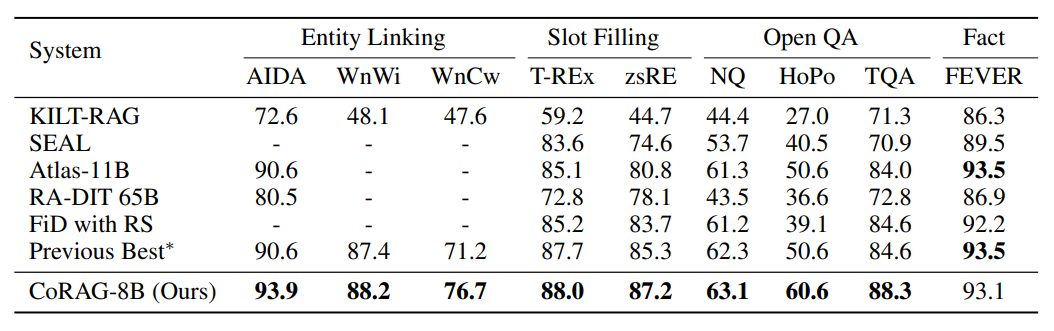 CoRAG-8B sets new performance records across all KILT tasks, except for FEVER, where it falls slightly behind an 11B-parameter model. It surpasses previous best scores in entity linking, slot filling, open QA, and fact-checking tasks.