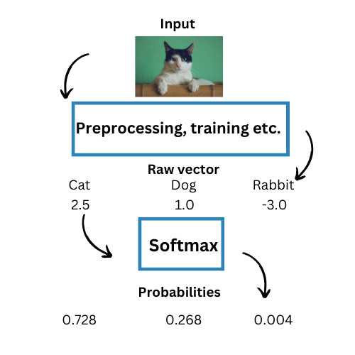 For example, consider a Convolutional Neural Network (CNN) that uses the Softmax function in its final layer. The task is to classify images into “Cat”, “Dog”, and “Rabbit”. Suppose the probabilities assigned to each vector components each class are [0.728, 0.268, 0.004]. In this case, the softmax output vector with highest probability is assigned to “Cat”; hence, it will be the final output.