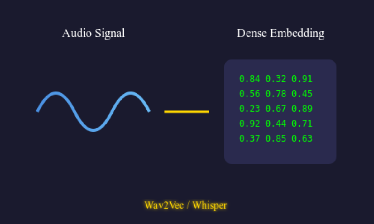 Figure: How models like Wav2Vec or Whisper transform audio signals into dense embeddings