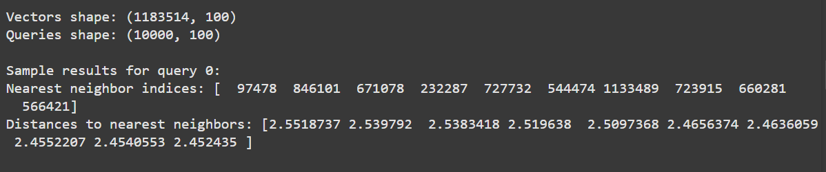 The output displays the nearest neighbor indices and their distances for the first query. The distances are similarity scores, where lower values indicate higher similarity.