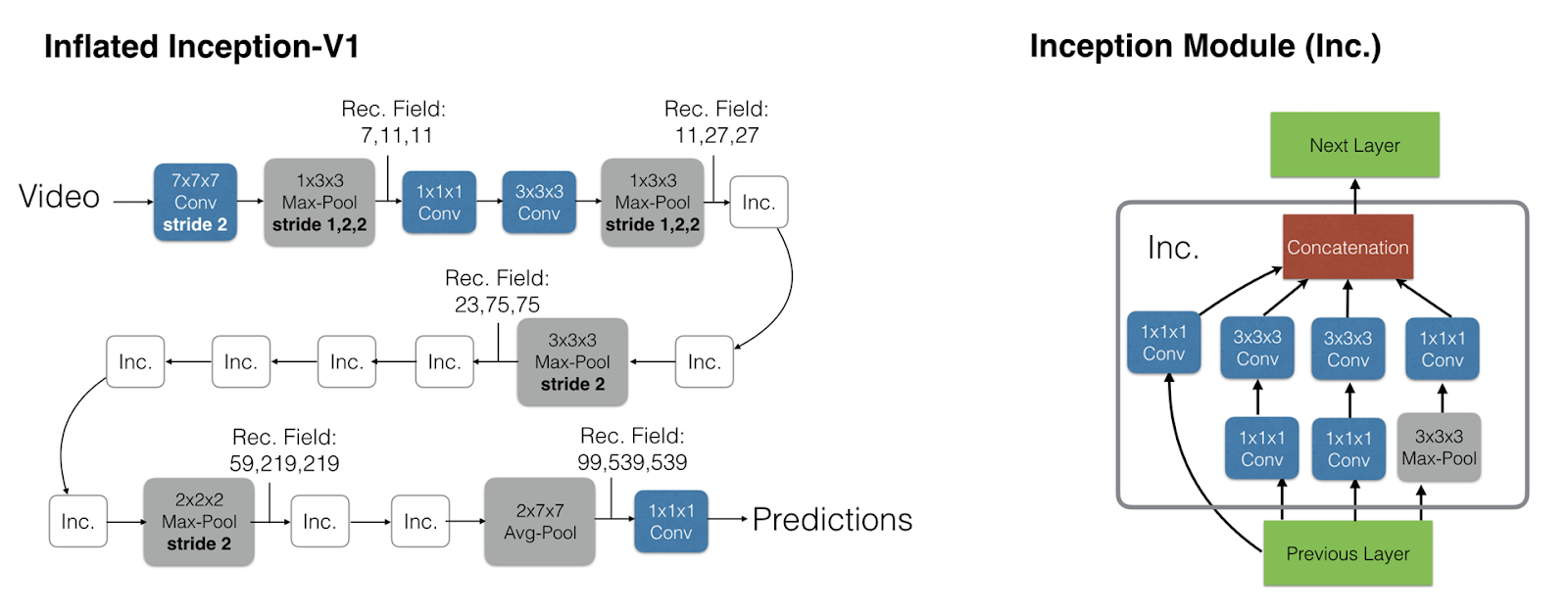 An example of inflated Inception-V1 architecture (left) and its inception submodule (right) (Source)